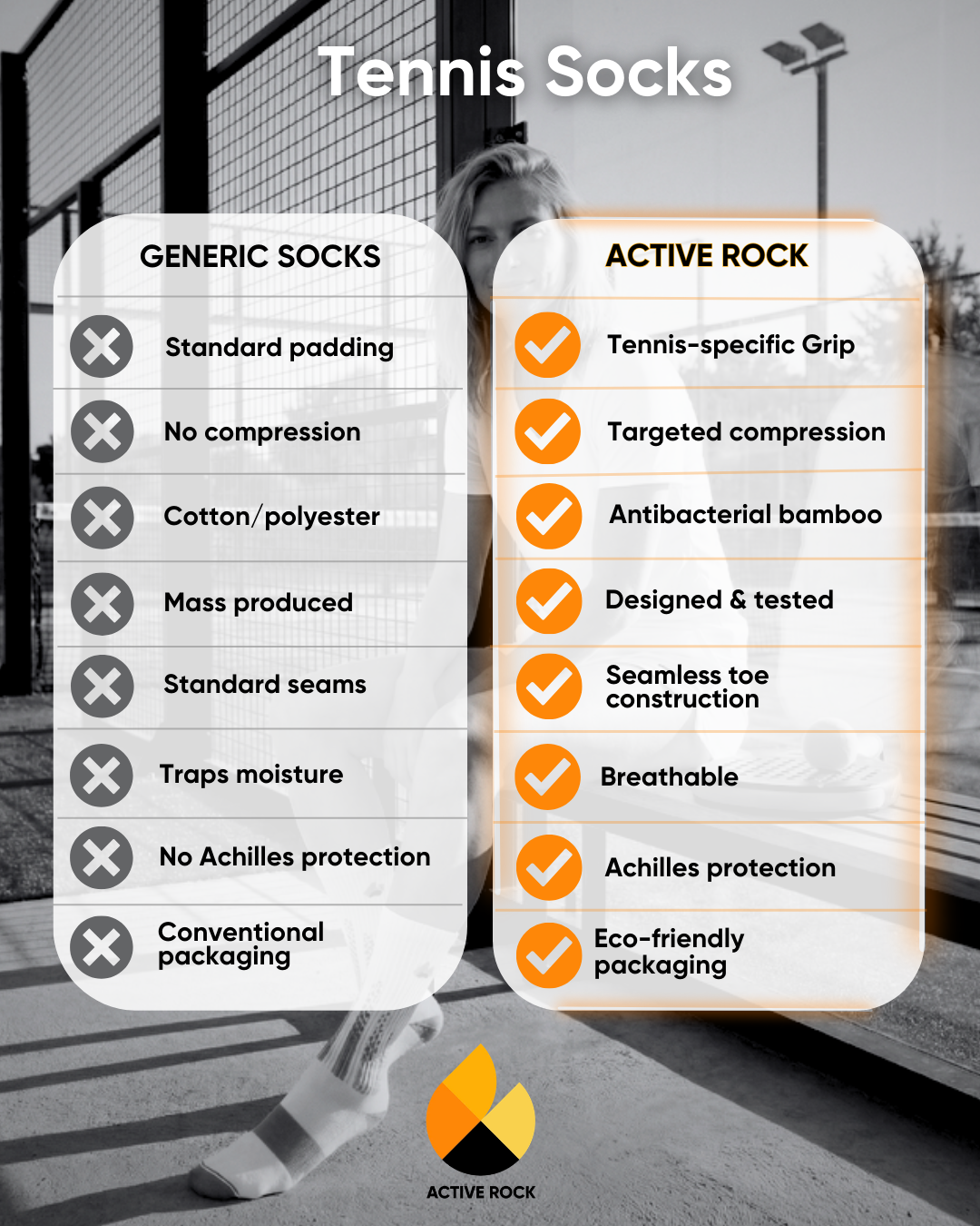 Discover the Active Rock difference — our tennis socks are engineered for athletes who demand more. Unlike generic options, Active Rock tennis socks deliver sport-specific grip, targeted compression, and antibacterial bamboo comfort.